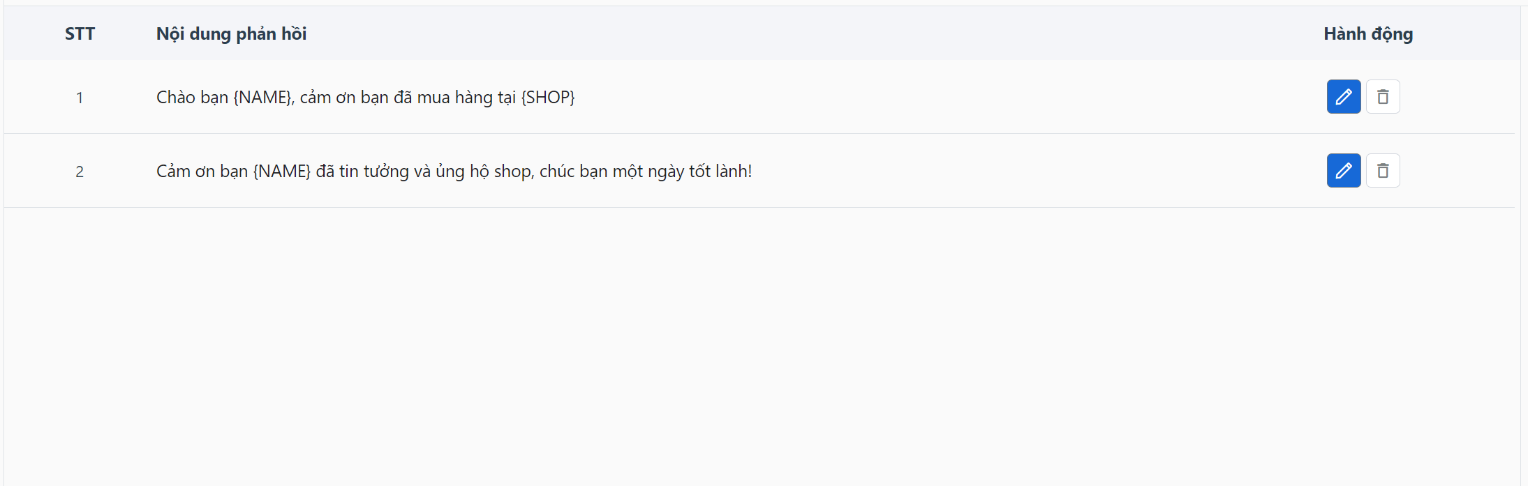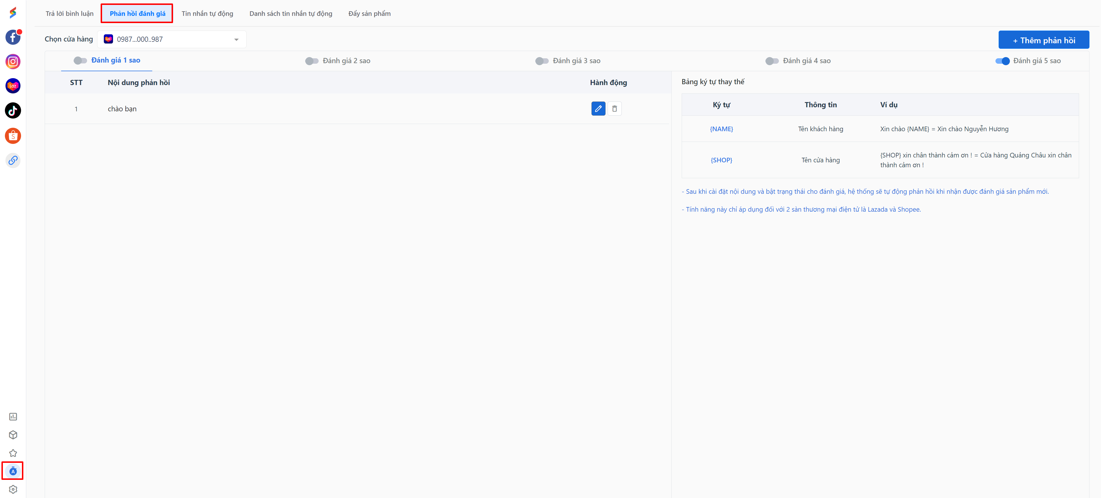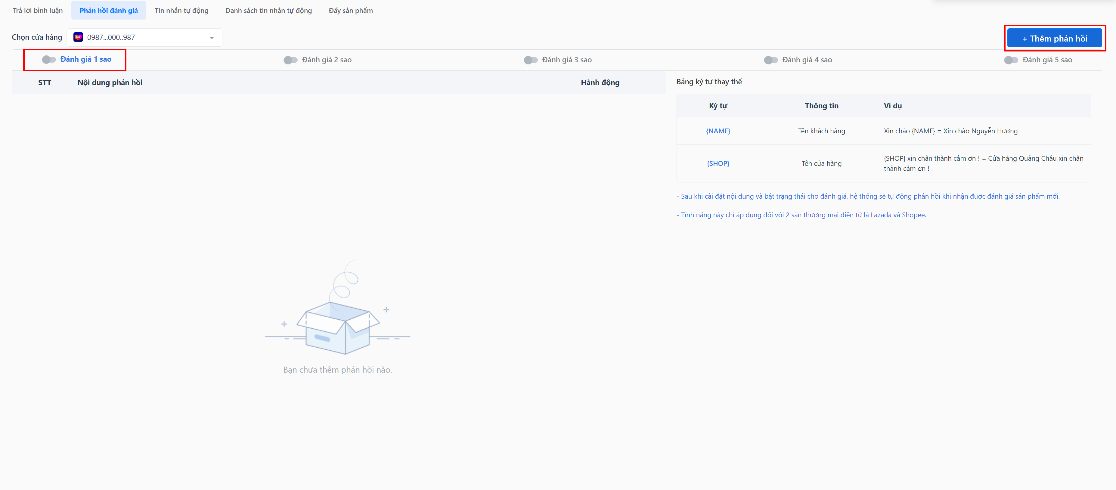 * Hệ thống cho phép bạn thiết lập tối đa 5 mẫu câu phản hồi đánh giá của khách hàng.