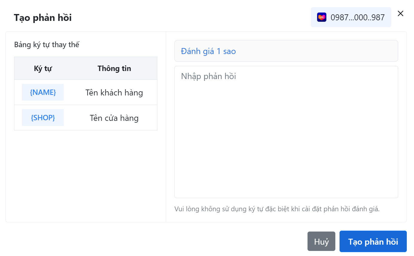 * Vui lòng không sử dụng ký tự đặc biệt khi cài đặt phản hồi đánh giá.