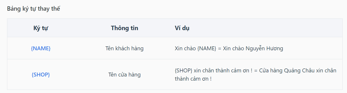 Đối với trường ký tự thay thế {SHOP}, hệ thống sẽ ưu tiên lấy theo tên biệt danh bạn đã đổi. Nếu không có tên biệt danh, hệ thống sẽ lấy theo tên hiển thị trên sàn TMĐT.