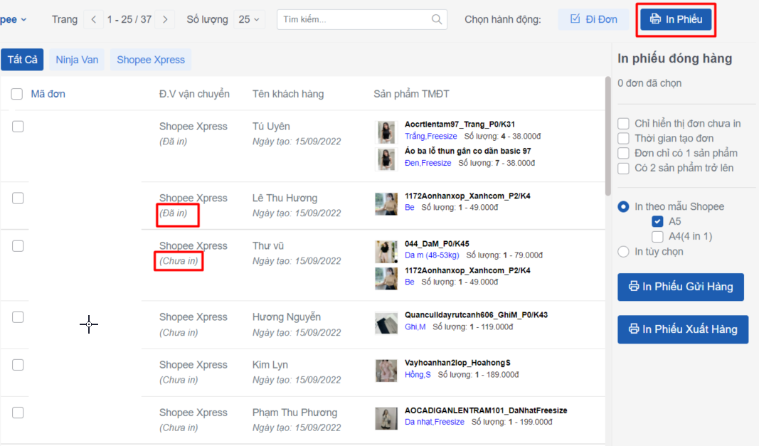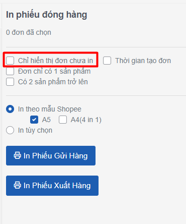 Sau khi in phiếu gửi hàng xong, hệ thống sẽ đánh dấu các đơn hàng này từ trạng thái Chưa in sang Đã in. Bạn cần bỏ tích bộ lọc **Chỉ hiển thị đơn chưa in** để in phiếu xuất hàng.