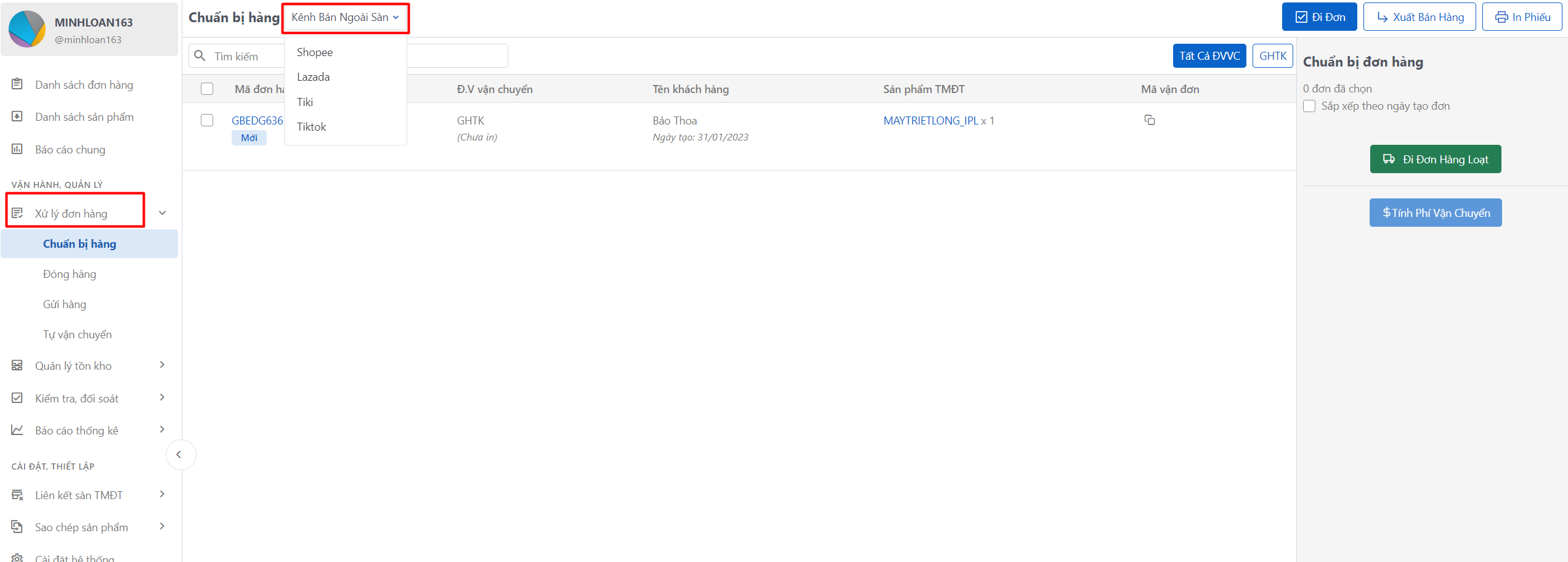 Bạn truy cập vào mục **Xử lý đơn hàng** > Chọn **Chuẩn bị hàng** và chọn kênh sàn mà bạn muốn xử lý đơn hàng