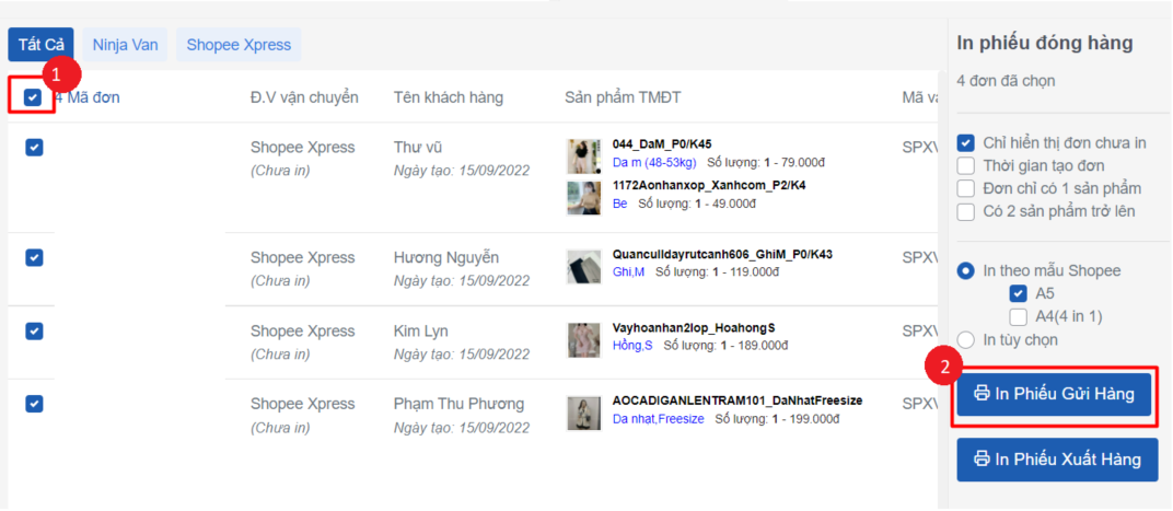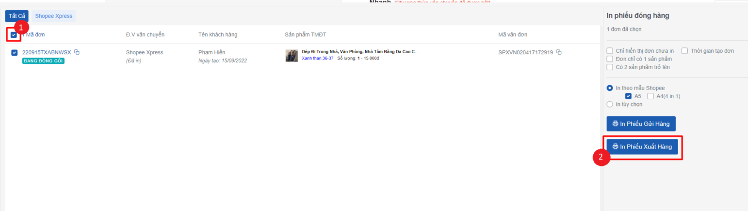 * Thao tác: Bạn tích chọn đơn hàng cần in phiếu > bấm **In phiếu xuất hàng**