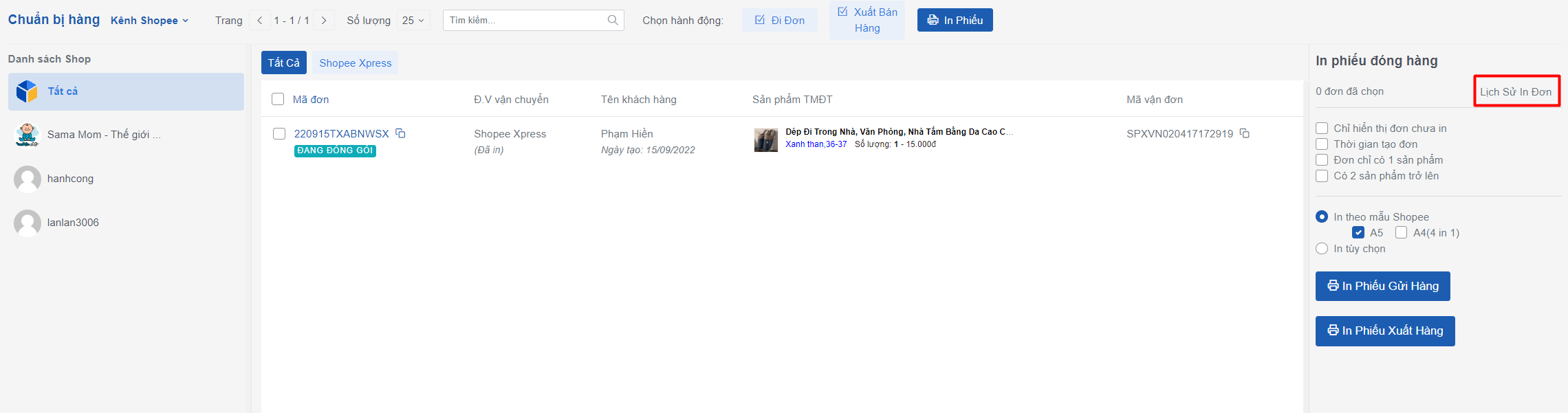 * Bạn chọn đơn hàng cần in phiếu > Bấm **In phiếu gửi hàng**&#x20;
