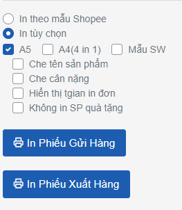 * In tùy chọn với các lựa chọn mẫu phiếu A5, A4( 4 in1) và theo mẫu Salework. Ngoài ra, bạn có thể lựa chọn một số trường thông tin như: Che tên sản phẩm, Che cân nặng, Hiển thị thời gian in đơn, Không in SP quà tặng trong phiếu giao hàng.&#x20;