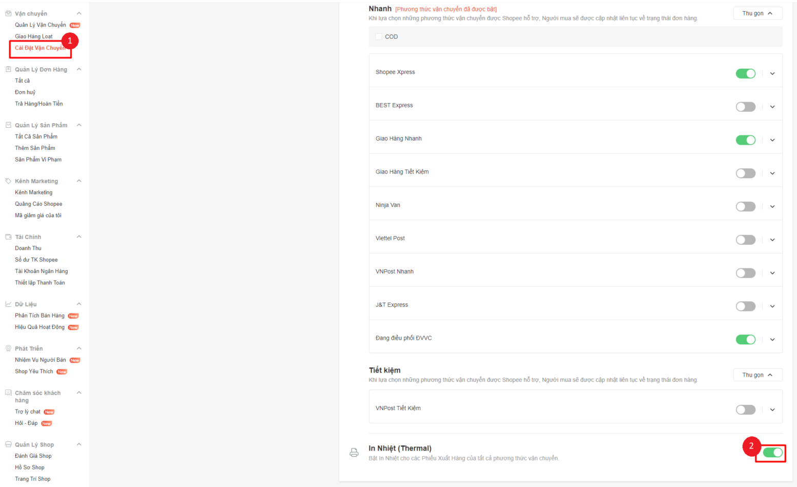 * Đối với sàn shopee, để in 1 phiếu/trang tại Salework Kho, bạn cần bật chế độ in nhiệt trên shopee bằng cách: Truy cập vào kênh người bán shopee > Chọn **Cài đặt vận chuyển** > Bật chế độ **in nhiệt.**