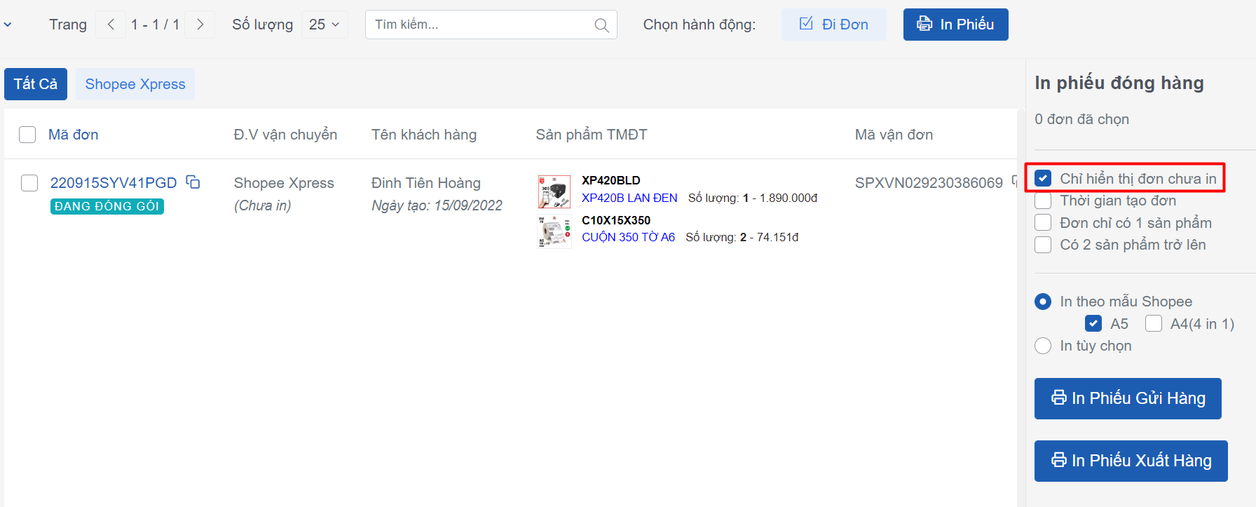 Bạn có thể bỏ tích bộ lọc để xem toàn bộ đơn hàng ở trạng thái **Đang đóng gói** của shop.Tại đây, sẽ hiển thị tất cả các đơn hàng đã in hoặc chưa in phiếu gửi hàng, đơn hàng sẽ không còn hiển thị trong mục này nếu đơn hàng đã chuyển khỏi trạng thái **Đang đóng gói.** Ngoài ra, hệ thống sẽ chỉ lọc được những đơn hàng đã in và chưa in khi bạn toàn bộ đơn hàng bạn in phiếu tại Salework. Trong trường hợp nếu phiếu đó bạn đã in trên shopee hoặc các phần mềm thứ 3 khác thì khi kiểm tra tại Salework, hệ thống vẫn ghi nhận phiếu đó ở trạng thái chưa in.