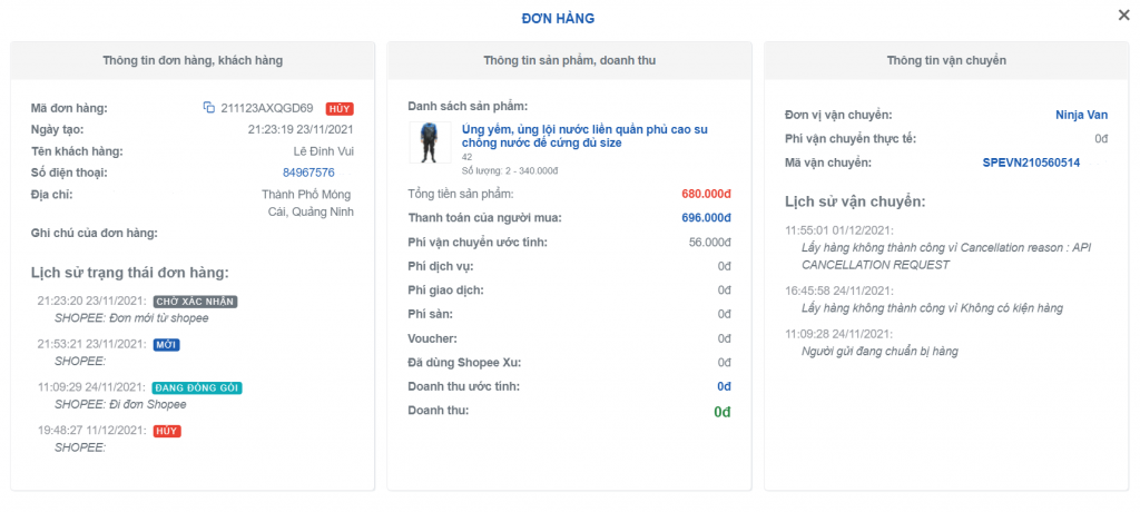 Để xem thông tin chi tiết của đơn hàng, bạn ấn chọn vào Mã đơn hàng. Toàn bộ thông tin liên quan đến đơn hàng sẽ được hiển thị trên màn hình bao gồm: tên sản phẩm, doanh thu, trạng thái đơn hàng,....