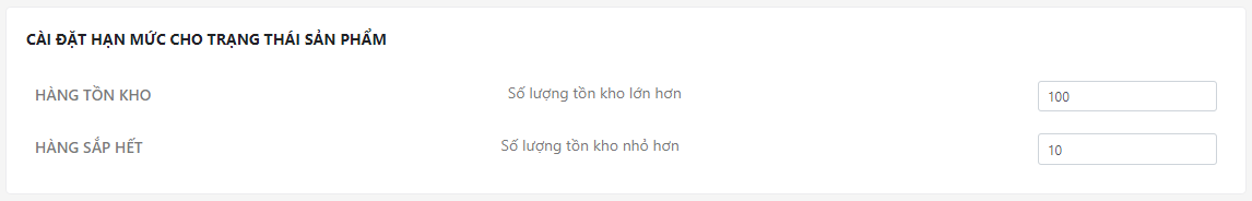 **Bước 2:** Tại mục **Cài đặt hạn mức cho trạng thái sản phẩm**, bạn lần lượt cài đặt số lượng cho các mục hàng tồn kho và hàng sắp hết.
