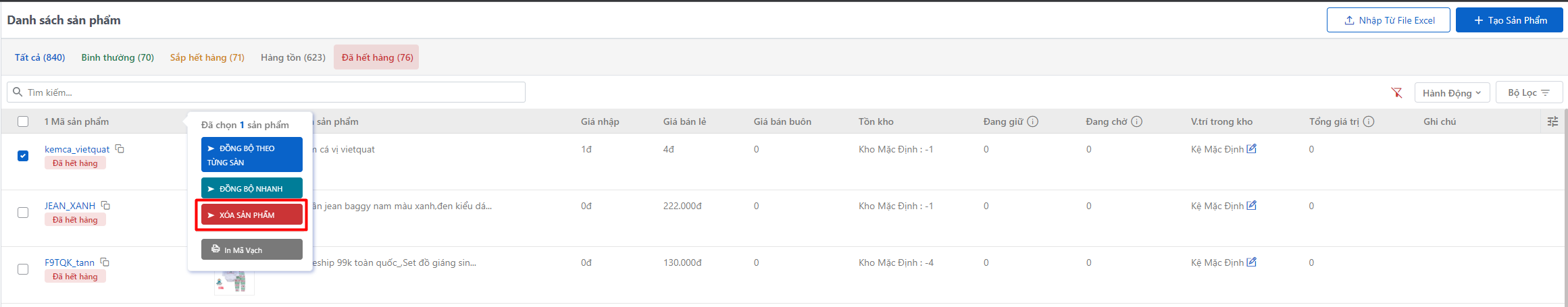 * Với thao tác này, bạn sẽ xóa được tối đa 100 mã sản phẩm/ lần.
