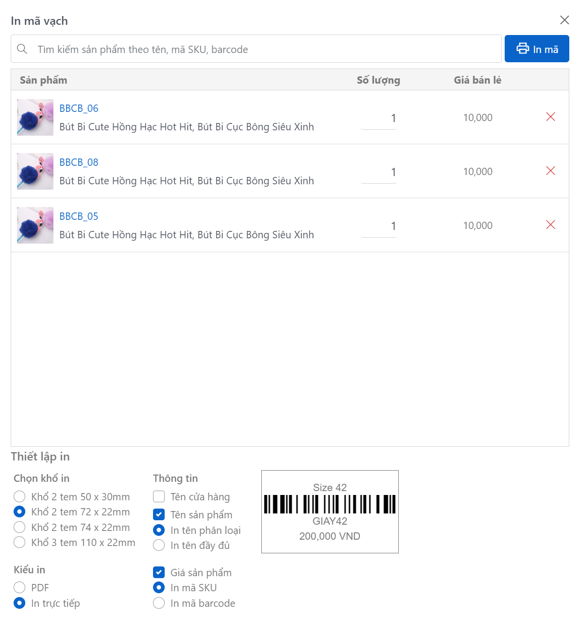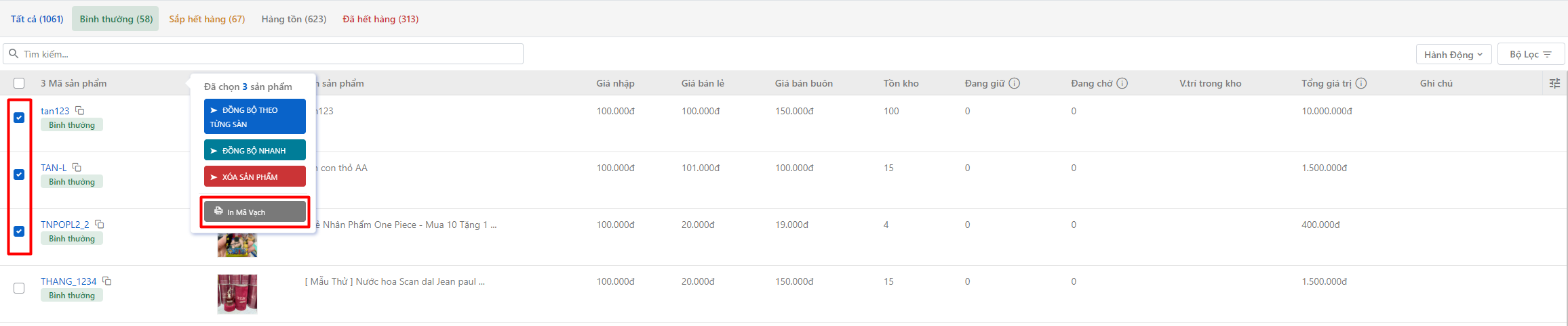 **Bước 1:** Tích chọn mã sản phẩm cần in > Bấm **In mã vạch.**