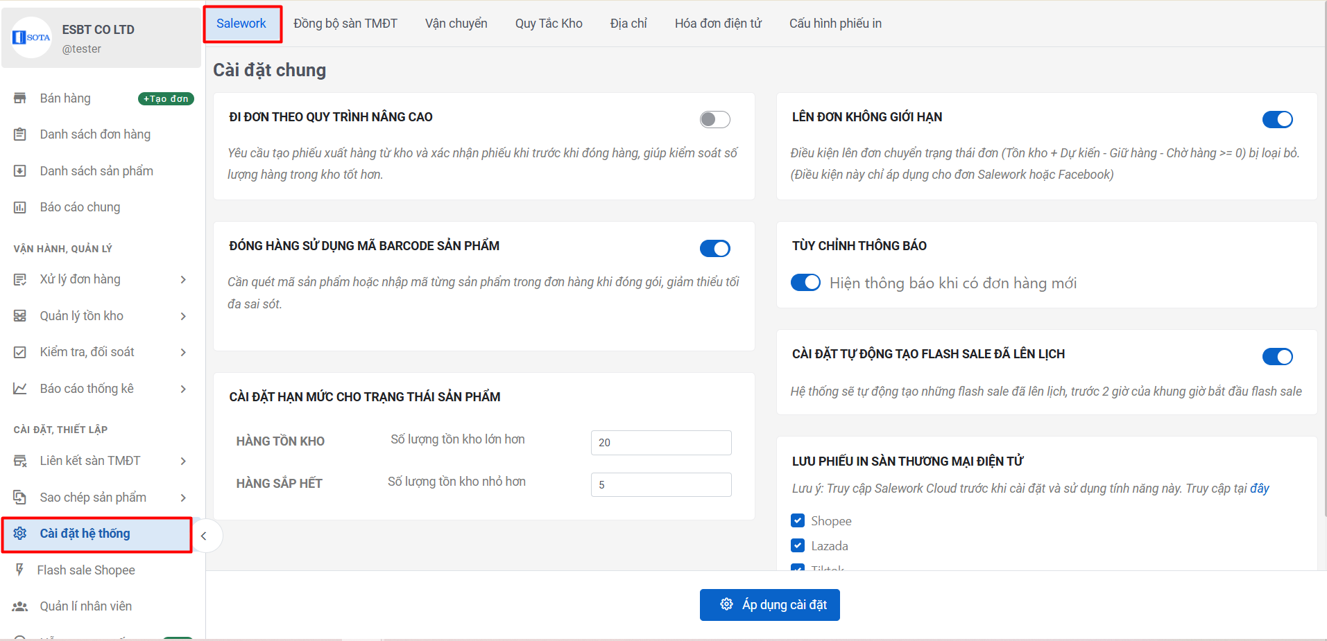 **Bước 1:** Bạn truy cập vào mục **Cài đặt hệ thống** > Chọn **Salework.**