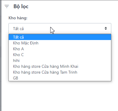 Để xem số lượng tồn kho chính xác sản phẩm trong từng kho, tại mục **Bộ lọc,** bạn tiến hành lọc kho hàng mà bạn muốn xem.&#x20;