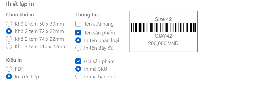 Tại đây, bạn chọn khổ in, kiểu in và thông tin bạn muốn in tem