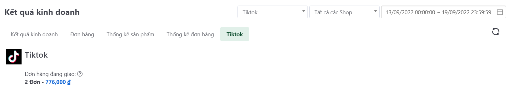 Hiển thị tab Lazada/Tiki/Tiktok khi lọc theo sàn Lazada/Tiki/Tiktok. Thống kê doanh thu dự kiến và số lượng tất cả các đơn hàng Lazada/Tiki/Tiktok ở trạng thái đang giao không theo điều kiện lọc.