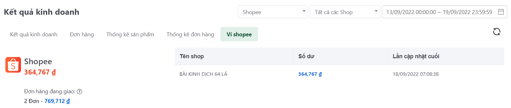 Hiển thị tab Ví shopee khi lọc theo sàn Shopee. Thống kê số dư tài khoản Shopee của các gian hàng Shopee đã liên kết, doanh thu dự kiến và số lượng tất cả các đơn hàng Shopee ở trạng thái đang giao không theo điều kiện lọc.