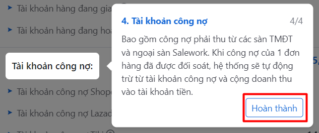 **4/4. Tài khoản công nợ**: Bao gồm công nợ phải thu từ các sàn TMĐT và ngoại sàn Salework. Khi công nợ của 1 đơn hàng đã được đối soát, hệ thống sẽ tự động trừ từ tài khoản công nợ và cộng doanh thu vào tài khoản tiền.