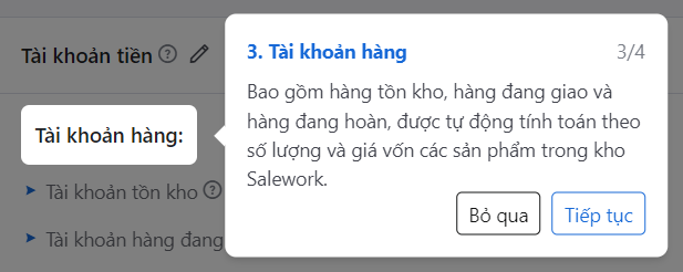 **3/4. Tài khoản hàng**: Bao gồm hàng tồn kho, hàng đang giao và hàng đang hoàn, được tự động tính toán theo số lượng và giá vốn các sản phẩm trong kho Salework.